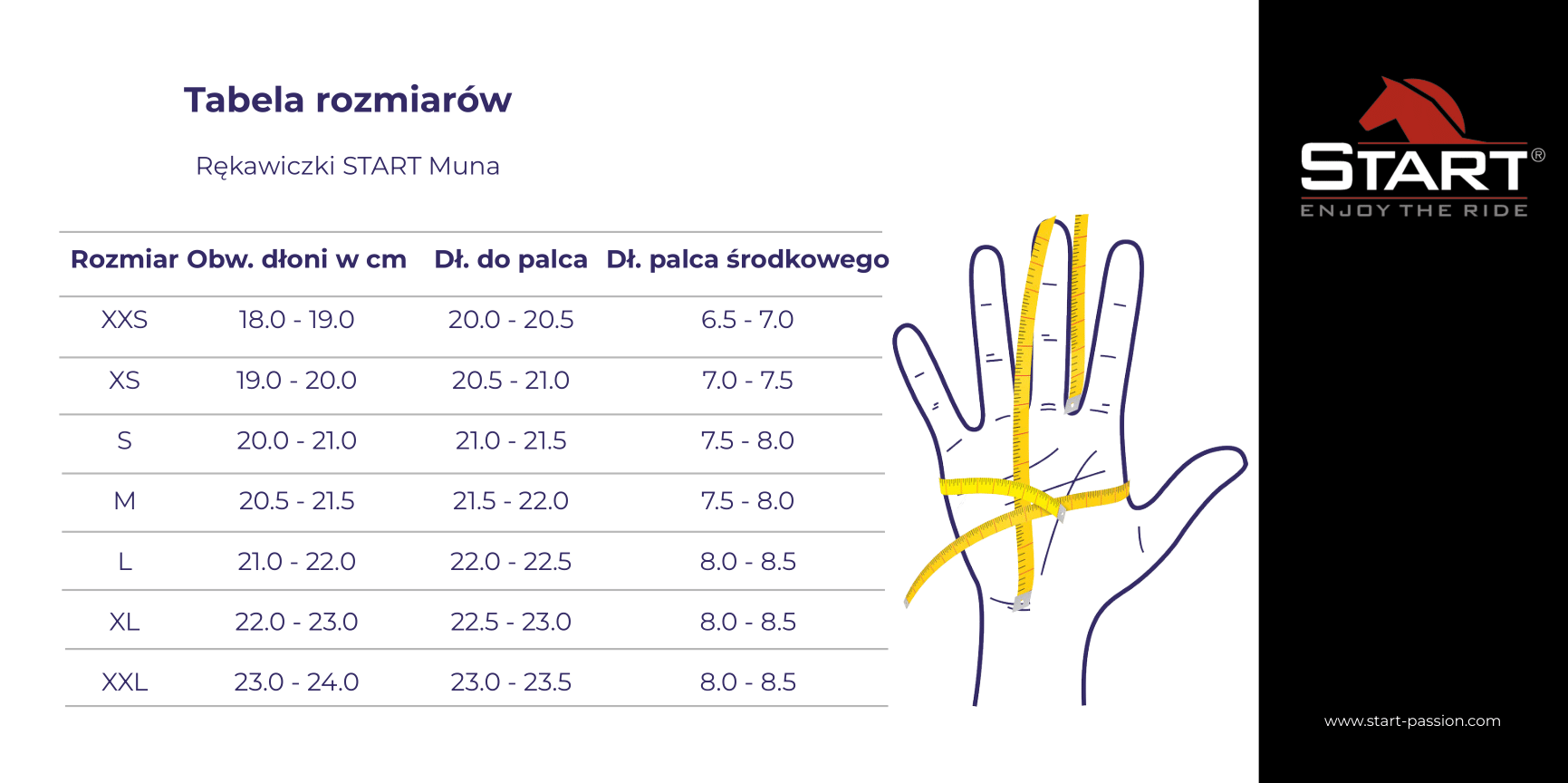 Rękawiczki dla osób ceniących sobie jakość oraz komfort użytkowania. Wykonane są z antypoślizgowej, wytrzymałej skóry syntetycznej, zapewniającej dobrą przyczepność wodzy do dłoni. Zawierają wstawki z elastycznej siateczki, która zapewnia lepsze dopasowanie rękawiczek do dłoni oraz większą przepuszczalność powietrza. Dodatkowo oddychalność materiału potęguje jego dziurkowanie na palcach. Zapinane na rzep z logo firmy "START". Dostępne są trzy warianty kolorystyczne tego modelu: czarne, czarne/szare oraz szare/czarne.